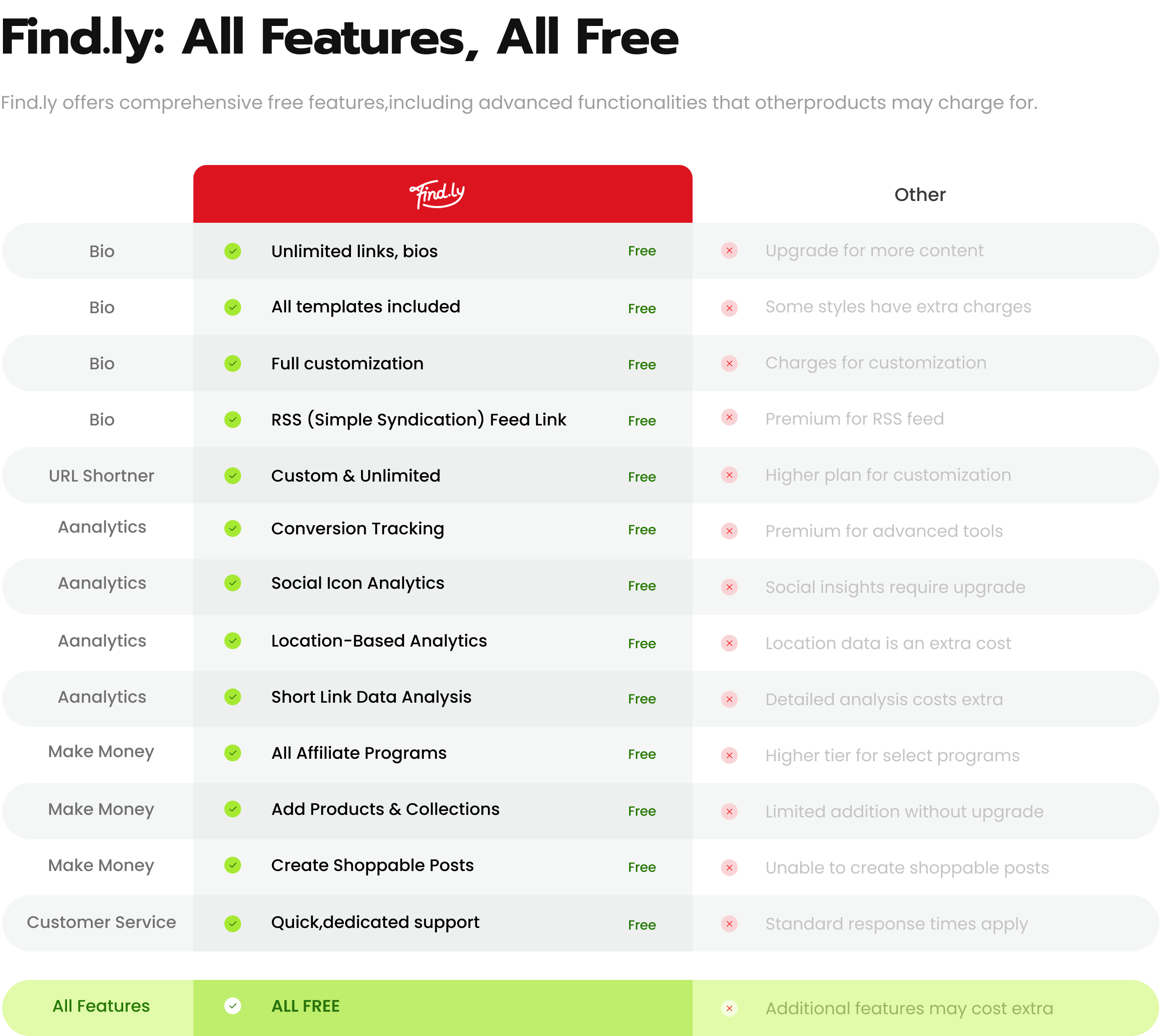 Sick of running into paywalls just to unlock basic features for your link in bio? Many platforms claim to be “free” but end up charging for essential tools like customization or analytics. Find.ly is different. We believe that powerful tools should be available to everyone. Take a look at this comparison to see why Find.ly’s free plan beats the competition and really gives you the best free link in bio experience.